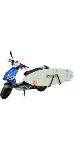 orthcore "Moto Rack" Moped Surfboard Carry Rack: Here's a fantastic product from Northcore - The "Lowrider" Moto Rack Motorbike and Scooter surfboard carry rack! The rack is an super simple design made from lightweight alloys, with a steel mount and high quality EVA foam to protect the board. The rack fits to any scooter, moped or motorcycle which has a rear carry rack attached. The rack will carry most boards right up to 8'0 mals. The rack takes only a few minutes to fit and is easy to disassemble when not being used. The rack is designed for lower speed urban riding/speed limits so is perfect for a run down to your local beach or taking on holiday if you're hiring mopeds, avoiding traffic and parking fees. The Moto Rack is packaged in a bright retro inspired heavy weight cardboard box, including fitting instructions, so is ideal for storing your rack when not in use.
