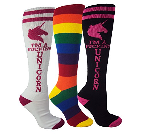 I'M A FUCKING UNICORN!! Show all you sunshine, rainbows, fairy dust, magic sparkles, and your special unique Unicorn horn in these pink knee-highs!! Your friends family and other mythical creature friends will sure get a kick out of these socks. But, don't worry, they come magically imbued with all the Moxy performance features so you can sail out into the cosmic universe on a rocket ship made of rainbows! Completed with three socks in one easy to order pack, with a Black and White Unicorn, and our Rainbow Knee High Socks. Women's Adult Size, Black with Pink. Rainbow.