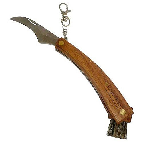 The Mushroom Collecting Knife is a knife designed specifically for harvesting mushrooms. It has a specially shaped curved blade with a serrated back that is made from stainless steel so it will resist rusting. It also has a fold away brush attached at the
