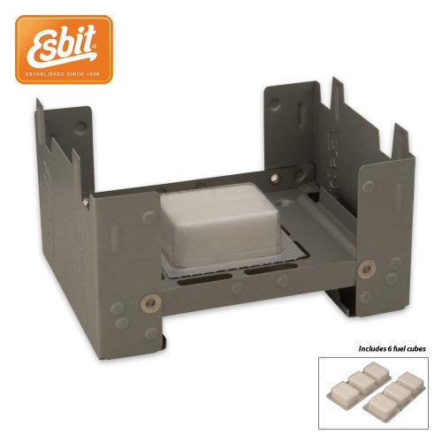 Two Individual Esbit Pocket Stove With Six Fuel Cubes Each = 12 Cubes Total. Ideal for backpacking, camping or to have as your home or auto emergency kit, this pocket-size stove folds down to a small, compact size. Includes six 14g solid fuel cubes that burn about 12 minutes each. Constructed from electrolytic galvanized steel. Cooking grade is selectable in two steps, and is suitable for cups, pots, and pans. Measures 3.9" x 3" x 0.9" when closed.