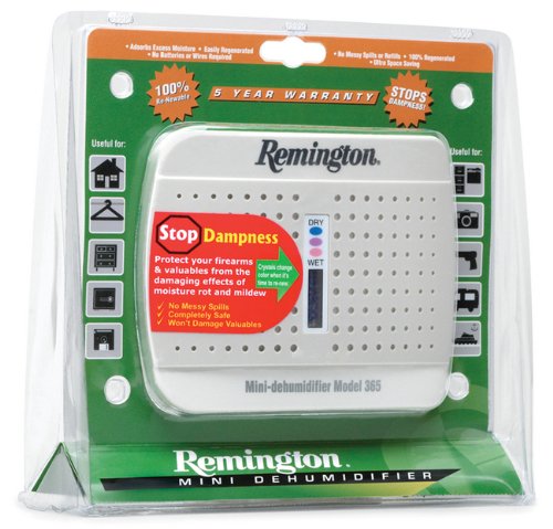 Compact unit attracts & holds moisture through water crystal technology to protect Gun Safes and Cabinets. Protects 30-60 days before recharging is necessary. Needs no wiring or extension cords. Recharges in just a few hours. Manufacturer: Remington. Model: 365. Type: Rechargeable. Description: Dehumidifier. Packaging: Box. Manufacturer Part #: 19950.