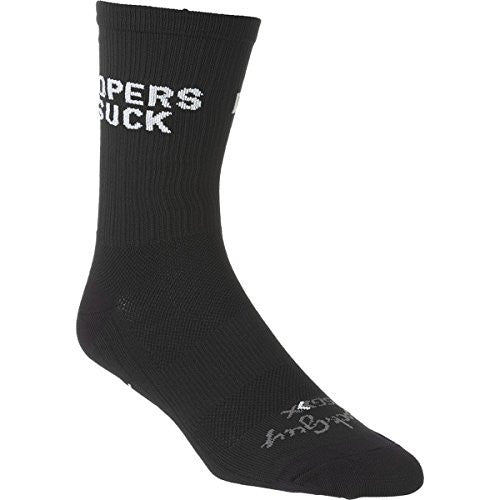 Just in case you didn't get the memo, Dopers Suck. These socks, however, do not. They're SG's high-tech premium pair. The Sock Guy SGX6 Dopers Suck Socks provide a compressive fit for optimal circulation, ribbed cuffs for comfort and breathability, and smart paneling for increased ventilation, reduced material movement, and less in-foot friction. Made of a fancy blend of polypropylene, nylon, and spandex, they keep strong the Sock Guy tradition of reinforced heels and toes for durability, too. As cycling socks go, these are genius. Available with 6-inch cuffs in sizes S/M and L/XL. Made in the USA.