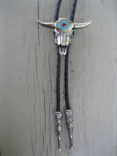 Steerhead Bolo Tie With Turquoise And Coral Inlay Made In The USA