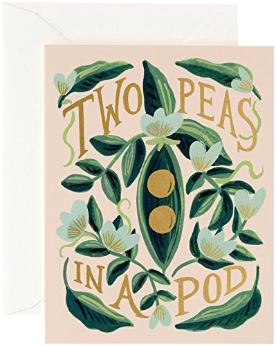 Love Greeting Card, Two Peas in a Pod, is a single folded card with gold foil, a blank interior and a soft white envelope.