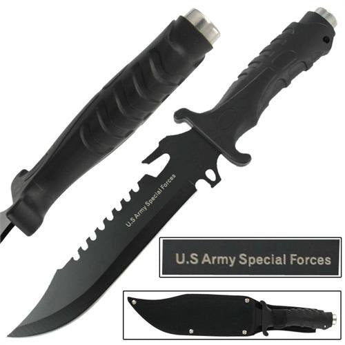 A very sharp point is incorporated into this bowie-styled clip point knife. Razor sharp 440 stainless steel makes the perfect knife edge. We tested the sharpness on several props and the blade remains as sharp and consistent as when we pulled it out of the package. Strike flint or fire-steel with the serrated spine. Conveniently enough, a bottle opener is located above the S-shaped hand guard. Two lanyard holes make it easy to tie the knife to a pole or strap. A solid block of ABS is fused to the knife and tacked by rivet. At the back of the handle is a solid stainless steel weighted hammer pommel. The hammer pommel is about 20mm wide and could hammer a stake into the ground. The uses for the US Army Extrema are endless. Handle is flat black in color.