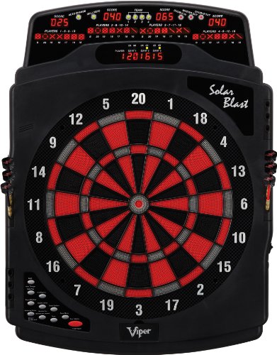 The Viper Solar Blast electronic dartboard is designed with a regulation sized 15.5" target face and a bright LCD display that delivers a crisp, clear view of scoring and statistics; eliminating manual scorekeeping. Surrounding the target face is a large missed dart catch ring which offers protection for your wall from errant throws. This dartboard is constructed from commercial-grade nylon segments which provide an exceptionally durable playing surface and offer a quieter gameplay experience compared to traditional materials. The stylish color scheme showcases red, silver and black, further enhancing your gameplay experience. An ultra-thin spider greatly reduces bounce outs, allowing for closer dart groupings to maximize scoring. The Viper Solar Blast is intended to be used with soft tip darts and features 43 games with 187 options; accommodating up-to 16 players. Popular options include cricket, 01, single in/out, double in/out and double bull. This electronic dartboard includes 6 starter darts and mounting hardware. The Viper Solar Blast is powered by an external power supply adapter (5V, 1000 mA), replacing the need to use batteries. GLD Products proudly stands by the quality of their products, offering a limited 1 year manufacturer warranty.
