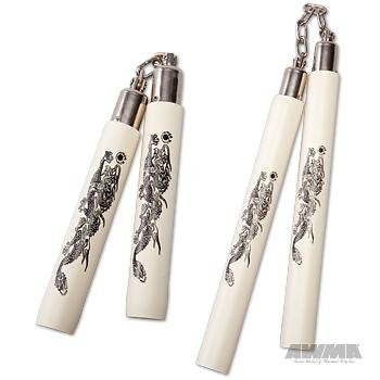 Foam practice nunchaku with black dragon design. Durable 1/4" foam with PVC inner core. Ball Bearing attachment for smooth movement. Great for beginners. Sold Individually.