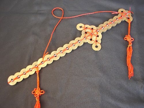 The coin sword is consisted of a lot of Chinese coins. It is also called money sword. Coin sword is used to ward of bad spirits and protect your home. You can hang the coin sword above your main door or on the wall of the living room facing out to protect bad energies from entering your house. The dimension of the coin sword is approx. 15" in length. Each of the coins is approx. 7/8" in diameter.