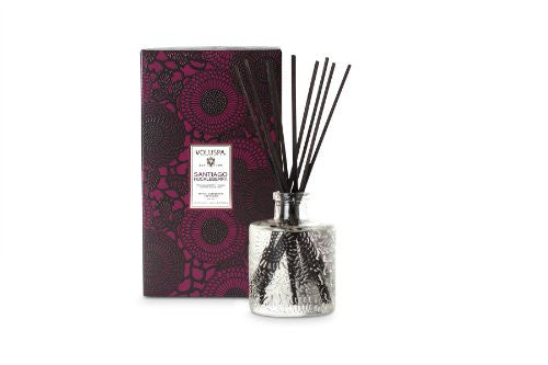 Voluspa Santiago Huckleberry Mini Diffuser is the combination of ripe huckleberry mixed with vanilla pods and crushed sweet sugar cane for a sweet, delicious scent.