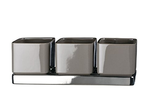 This planter set includes 3 ceramic planters which sit inside of a reflective metallic saucer. The dark grey and silver color scheme is neutral enough to fit in with just about any style. Cubes measure 3"H x 3.5"L x 3.5"W. Saucer measures 12" long x 1" deep. Bottoms do not feature drainage holes.