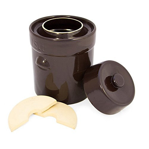 The TSM German style Harvest Pots, made in China, replicate traditional European design and feature an attractive deep rich, dark brown glaze. Each crock is lead and cadmium free and is constructed with a water sealable cover to keep out oxygen and mold, thereby creating the perfect environment to promote lactic acid vegetable fermentation. Each crock is suitable for long term food storage. Stone weights are included and used to keep vegetables under their fermenting liquid during fermentation. Easily make healthy homemade, Probiotic vitamin enriched foods, full of nutrients and natural enzymes. Easily makes traditional sauerkraut, Kimchi, Kombucha and pickles. The TSM fermenting pot can also be used for brining olives and can be used to ferment beets, onions, beans, carrots, peppers plus more of your favorite vegetables.