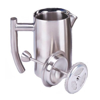 Frieling 44 fl. oz. Stainless Steel French Press. This attractive French Press is constructed of high-quality 18/10 stainless steel that is revered for its elegance, zero maintenance and heat retention. Celebrate the pure flavor of coffee with the double wall insulation, which retains heat four times longer than glass! Extremely durable and made for everyday use. The entire unit, from its beautiful exterior to the inside plunger mechanism, is simple an easy to use: Fill the press with ground coffee and hot water, stir, place the lid/plunger unit on top and steep for 4 minutes, then slowly press the plunger down. Coffee is ready to serve in minutes! Multifunctional and not just for coffee, this French Press is perfect for brewing loose tea or serving cold beverages in the pitcher (water, milk, ice tea, juice, etc.). No need to disassemble the plunger. All components are dishwasher safe and naturally BPA free. Holds 44 fluid ounces. Materials: 18/10 Stainless Steel. Dimensions: 4.5"L x 7"W x 10.25"H Weight: 3.1 lbs.