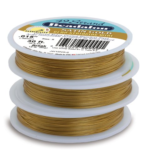 Satin Colors give your designs a soft, warm glow of Gold. The special nylon coating on Satin Colors offers a soft, silky feel and a unique, matte coloring. Use this wire exposed as part of your jewelry, and with plated findings, for added elegance and beauty. Created through our special process, super flexible 49 Strand stainless steel wire is sheathed in a special nylon coating, giving it thread-like flexibility. Your crystal, gemstone, and glass beaded designs will look more elegant and feel as if they were strung on silk. Create designs with the lavish look of Gold at a fraction of the cost. Made in USA by Beadalon.