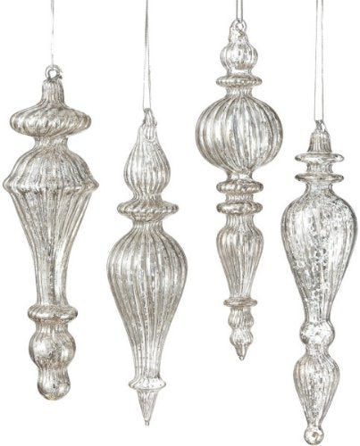 You will receive 4 beautiful silver/mercury styled glass Christmas ornaments. These blown glass silver drop ornaments have delicate vertical lines pressed in the design. There are 4 different styles in this collection. Mercury Silver Finish, 4 Assorted Shapes, Made of Glass, Ready to hang with a silver cord. Two Sizes: 1.5" x 6.5" and 2" x 7" #ornaments #silver #mercury #glass #drop #ChristmasOrnament Antiqued Silver Glass Drop Ornaments.