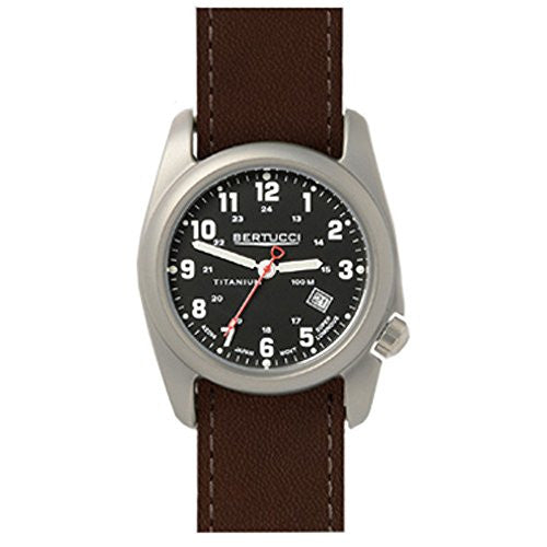 Bertucci 12087 Brown Leather Strap Band Black Dial Watch. Durable U.S. patented matte finish solid titanium A-2T case, Titanium screw down case back, Hardened sapphire or scratch-resistant hardened mineral glass crystal, All-metal Japan made quartz movement, Titanium screw down crown is ergonomically offset at 4 o'clock, Swiss super luminous hands & markers, 12/24 hour markings w/ date dial. Integrated unbreakable titanium band retention lug bars,100 M water resistance, Equipped with durability certified Active ComfortTM high performance bands, Made in the USA Horween leather band, One size fits all - Nylon, Leather band fits medium to larger, 10 year or 3 year battery life, 3 year warranty. The Bertucci Montanaro Survival Leather band combines rugged refinement, Active Comfort design and long lasting durability well suited for the most severe environments and activities. Made in the USA using only the finest high performance top grain water resistant leathers, heavy duty box stitching, full lining, and a stainless steel buckle and loop... simply unmatched in the marketplace. Stylish and attractive watch which creates an awesome personality. Directional, exciting and diverse, This Collection makes and breaks the fashion rules. Scouring the globe for inspiration, our Design Team is inspired by fashion's most covetable trends; providing you with a cutting edge wardrobe season upon season.