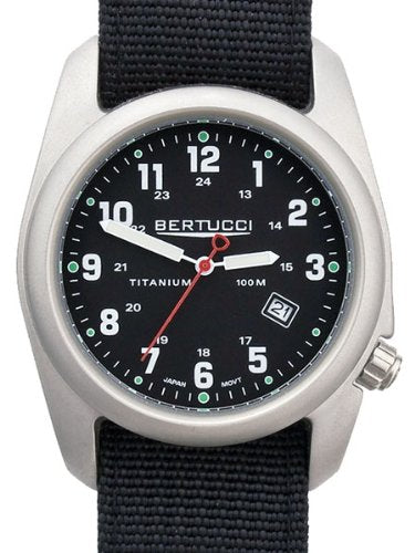 Sport watch, Japanese quartz movement, Polished white sword hands with luminous accents and red sweep seconds, Applied polished white Arabic numbers, Smaller white Arabic numbers form inner 24-hour time track, Applied luminescent green dot hour markers and white indices form surrounding minute track, Analog date aperture at four o'clock, Black dial, U.S. patented DX3® heavy duty 2-ply black nylon strap with contrast stitching and brushed black metal buckle, U.S. patented DX3® matte silver-tone titanium bezel and round case, Textured titanium screw-down crown with logo, Titanium screw-down caseback, Mineral crystal, 100 meters/328 feet water resistant