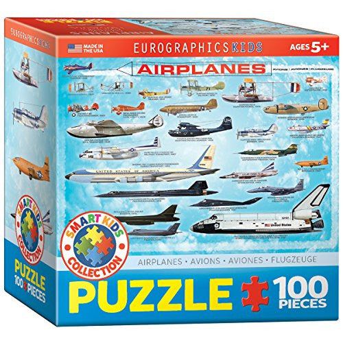 EuroGraphics Airplanes 100-Piece Puzzle (Small Box). Box size: 6" x 6" x 2.37". Finished Size: 10" x 13". Educational and fun, this jigsaw puzzle features over 20 aircrafts, ranging from classic to modern. Strong high-quality puzzle pieces. Made from recycled board and printed with vegetable based ink. This superior quality puzzle will delight and educate all at the same time.