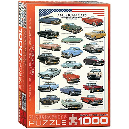 EuroGraphics American Cars of the Fifties 1000-Piece Puzzle. Box size: 10" x 14" x 2.37". Finished Size: 19.25" x 26.5". Over 20 of the most popular American of the 1950s are featured in this jigsaw puzzle. Strong high-quality puzzle pieces. Made from recycled board and printed with vegetable based ink. This superior quality puzzle will delight and educate all at the same time.