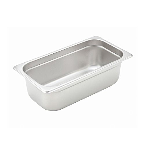 This Winco Pan is a 1/3-size and has an anti-jam design, ideal for steam tables or food prep areas. Constructed of standard weight stainless steel this steam table pan is simple to clean and resists corrosion, dents, scratches and stains. Designed with anti-jamming construction. The 4" depth will accommodate a variety of food sizes. 1/3-size Anti-jam design NSF Listed Dimensions: 12-5/8" L x 6-7/8" W x 4" H Model #: SPJH-304 6001983