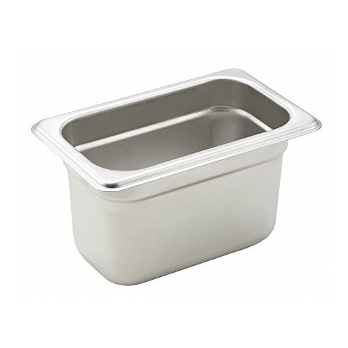 This Winco Pan is a 1/9-size and has an anti-jam design ideal for steam tables or food preparation areas. Constructed of standard weight stainless steel this steam table pan is simple to clean and resists corrosion, dents, scratches and stains. The 4" depth will accommodate a variety of food sizes. .Material: Stainless Steel 1/9-size Anti-jam design NSF Listed Dimensions: 6-3/4" L x 4-1/4" W x 4" D Model #: SPJH-904 6001984
