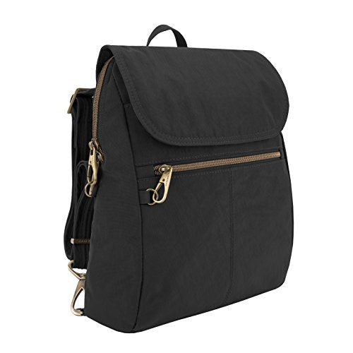 Travel light and carefree with the Travelon Slim Backpack. The roomy main compartment has smart organization and is large enough to carry an iPad. With Anti-Theft features like, slash & cut resistant straps and panels, locking zippers, RFID protected card slots and a RFID Passport pocket you can travel with confidence. The interior has 2 zippered wall pockets and a drop pocket that is perfect for glasses or other quick grab items. The adjustable straps allow you to find your perfect fit. Thoughtfully designed with a slash pocket for a smartphone, top grab handle for easy lifting or hanging and a magnetic front flap closure. Beautifully crafted from durable water and stain resistant nylon material an accented in stylish antique brass finished hardware. Corporate casual meets Professional with the Travelon Slim Backpack.