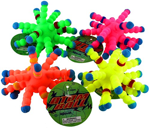 This atom ball is a great tactile toy for keeping your hands occupied. It's shaped just like an atom for a unique, quirky look. Safe to throw and catch, this makes a great stocking stuffer, and can even be used as a therapy toy for children with autism. Excellent for the science fan in your family! This is a pack of 4 Atom Balls, one of each color: Green, Yellow, Orange and Magenta