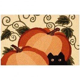Welcome Fall guests and trick-or-treaters to your home with the Autumn Watch rug from Jellybean rugs. Constructed of a polypropylene and acrylic blend, Jellybean rugs are very durable, will not fade, and feature a special twisted hook construction which keeps the yarn from picking and pulling. This rug features two large pumpkins and a black cat against a vine patterned background. A special non-woven porous backing lets water seep through so it will not mildew. 35% of the material in a Jellybean rug is recycled post-consumer PET plastic. Machine washable, this rug "washes better than your jeans."