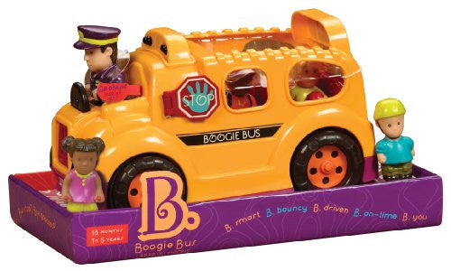 Press the driver’s head to RRRRoll! Vroom-vroom sounds your send-off. Back door opens and closes in case of emergency. Auto-off preserves batteries (and Mom’s patience). Toy measures 9.25” x 4.75” x 5.25”. 3 AA batteries included.. 100% recycled box. Vroom-Vroom sounds the send-off of our Boogie Bus Rrrroll Models. This bus features 4 fun friends, a back door that opens and closes in an emergency and an auto-off to preserve the batteries. 3-AA batteries required-included. Ages 18 months to 5 years.
