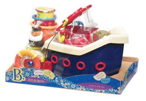 B. Fish and Splish Boat! Bath time has never been so much fun. Be the captain of your own boat. Catch a fish. Comb your hair. Clean your nails. Scoop up the water and pour it out. Floating boat with captain and life preserver. Fishing hook and 4 ready to catch fish. 3 nesting cups for showering, stacking and pouring. Octopus comb and whale nail brush.