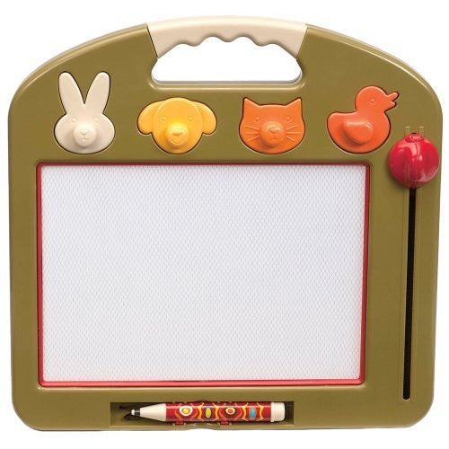 A never-ending sketchpad, just in case your ideas are never ending too. Toddlers can draw forever, anywhere - without a single crayon or sheet of paper! Our wipe-off doodle board is like the ones the big kids love, only simplified for small fry. With easy-grip pen, four self-storing stamps, and smooth-sliding eraser. And it's the only one backed with a padded lap rest for your little artist's comfort! Great travel toy; it's arts and crafts to-go! Phthalate-free. For ages 18 months and up. Imported. Colors may vary. Doodle board makes it easy to erase and start over: just slide down the ladybug knob Magnetic sketchboard includes bunny, dog, cat, and duck stamps Soft, tote-along handle Sketchboard measures 12 1/4"L x 3"W x 12"H; drawing surface is 9 1/4"L x 6 1/2"W, pen is 4 1/2"L x 1/2" in diameter, and magnet stamps are roughly 2" x 1 1/2" Great creative toy for toddlers and kids A portion of every purchase supports children's charities