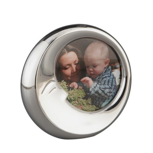 Dreamy and poetic, the Sleeping Moon Frame displays a favorite photograph with tenderness that is appealing from the nursery to the nightstand. Designer Sean O'Hara creates a graceful circular frame by connecting the tips of an elongated crescent moon so a picture is lovingly cradled behind a disc of glass. Subtle sculpting adds sleepy man-in-the-moon features, and a gleaming mirror finish brings out the frame's fluidity. A sweet gift for babies, new moms, or grandparents, the Sleeping Moon Frame is fashioned from lustrous Nambé alloy to ensure heirloom beauty and quality.