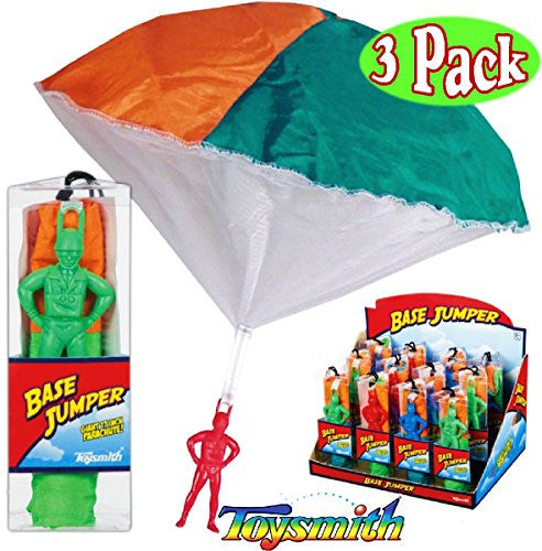 Gift Set Bundle Includes 3 Different Base Jumpers (Red, Blue & Green)! Launch these 4" base jumpers and watch them go! Each jumper comes with a no-tangle 17" diameter parachute. Perfect for travel, party favors, giveaways, schools, organizations, stocking stuffers, & so much more! Perfect for ages 5 and up.