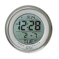 Radio controlled atomic LCD bathroom clock with suction cup. Displays day, month and time with split second accuracy as it received updated radio signals from National Time Observatory. Lock action suction cup holds to any smooth surface like wall tile or mirror. Silver finish, white trim in a 3.5in round cabinet.