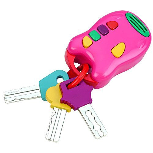 Enjoy hours of fun and learning with the Battat Electronic Keychain. Take a trip with this realistic toy car remote and keychain set. Play a variety of sounds, including car starting and idling, car alarm, car horn, and doorbell, with the push of a brightly colored button. 3 jangling keys dangle from the key fob that's perfectly sized from little hands. Power the remote with 2 included AAA batteries. This toy is recommended for ages 6 months and up.