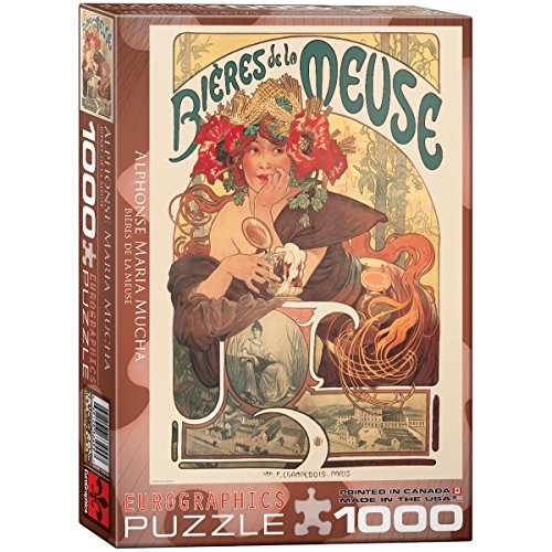 EuroGraphics Bieres de la Meuse by Alfons Mucha 1000-Piece Puzzle. Box size: 10" x 14" x 2.37". Finished Size: 19.25" x 26.5". Alfons Maria Mucha (1860 -1939), known in English as Alphonse Mucha, was a Czech Art Nouveau painter and decorative artist best known for his distinct style and his images of women. He produced many paintings, illustrations, advertisements, postcards, and designs. Strong high-quality puzzle pieces. Made from recycled board and printed with vegetable based ink. This superior quality puzzle will delight and educate all at the same time.