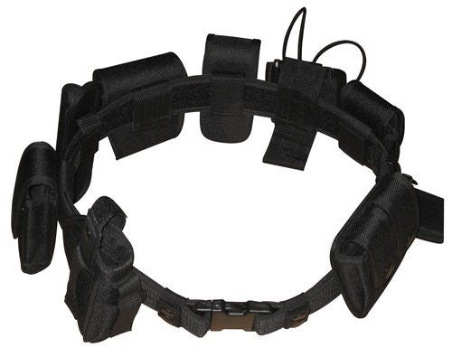 Manufacturer: TAIGEAR. Law Enforcement Modular Tactical Equipment System. Versatile modular design for Law Enforcement, Military Personnel, Security and Sport Enthusiasts. Complete tactical set with all the pouches and holsters required by tactical teams. Adjustable law enforcement duty belt with quick release buckle, belt keepers, dual magazine pouches with horizontal/ vertical secure systems, pager/cell phone/gloves case, key holder, chemical agent/pepper spray case with snap closure, universal radio case, handcuff case with snap closure, expandable baton case, flashlight case, and fully adjustable duty holster with extra mag pouch. Quick attachment with complete Locking and full adjustability. Belt can be adjusted from 35" to 54" .