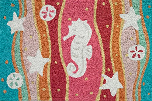 Unexpected colors frame a myriad of ocean life on this quaint JellyBean doormat. Seahorse, starfish and sand dollars hang in the stripe-y waves that mirror colors of tropical ports. Indooroutdoor doormats are part of a collection of rugs designed by many well known artists. Special patented construction keeps poly-blend twisted yarns in a hooked technique which prevents picking or pulling. Rugs are very durable and will not fade or mildew. And they are machine washable! Dimensions: 21w x 33 (35% of the material used in construction of this rug is made from recycled PET plastic).