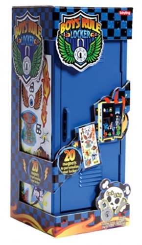 Store your most treasured valuables in the Boys Rule Locker, the perfect storage spot for your most important stuff. Almost 11 inches tall, this locker comes with a special padlock and 2 keys so you can protect your things. Inside the hinged door are two shelves, hooks on the door and even a mirror. Included is a sheet of 20 magnetic appliques so you can decorate your locker so it's perfect. Made of stamped steel, these lockers are just like the ones you use at school. For ages 4+.