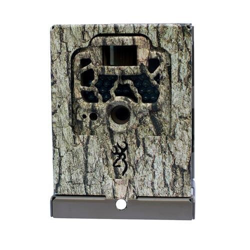 The Browning Game Camera Security Box features Heavy Duty 16 Gauge Steel, Powder Coated for Long Life, 2 Locking Channels for Python Cables, and accepts up to a 3/8” Padlock