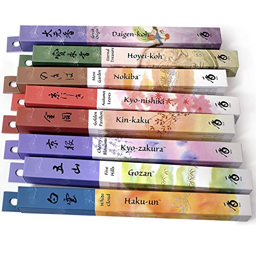 Bundle: Great Origin (30 sticks), Eternal Treasure (40 sticks), Moss Garden Nokiba (35 sticks), Kyoto Autumn Leaves Kyo-nishiki (35 sticks), Golden Pavilion Kin-kaku (35 sticks), Kyoto Cherry Blossoms Kyo-zakura (35 sticks), Five Hills Gozan (35 sticks) a