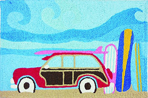 Indoor Outdoor Throw Rug, Catching Waves. Feature s a Woody with Surfboards.