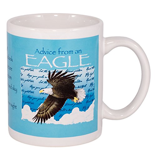 This 12oz ceramic mug is a practical birthday or holiday gift that is also fun and appreciated! Packaged in a sturdy box, this mug is also easy to gift wrap and mail! Front: Advice from an EAGLE Keep a keen outlook See the big picture Cherish Freedom Honor the earth and sky Be Proud Have your goals in sight Fly high!