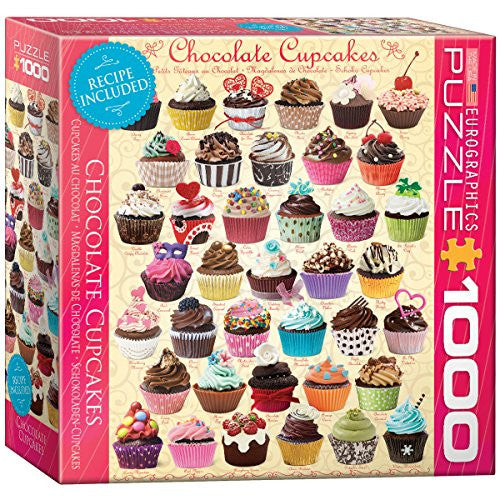 EuroGraphics Chocolate Cupcakes 1000-Piece Puzzle. Box size: 8" x 8" x 2.37". Finished Size: 19.25" x 26.5". You don't have to go to the bakery to enjoy a delectable assortment of chocolate cupcakes! Recipe included on the back of the box. Strong high-quality puzzle pieces. Made from recycled board and printed with vegetable based ink. This superior quality puzzle will delight and educate all at the same time.