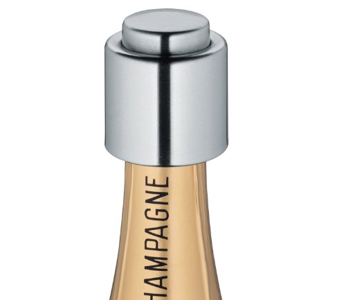 Stainless steel champagne sealer; 100% leakproof;Creates an airtight seal even with the bottle lying down; allows for horizontal storage of champagne bottles in the fridge;Pull down over the bottle opening to seal; to release, push the button and lift off;Made of brushed stainless steel shell;Inner diameter of 1.38 fits most bottles; dishwasher safe