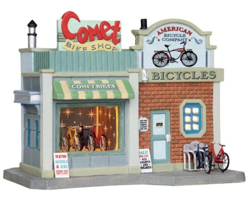 COMET BIKE SHOP Part of the Jukebox Junction collection. Retro '50s style. Porcelain lighted building. May be used with Carole Towne, Coventry Cove, Lemax Christmas Village or other brands of collectible buildings and accessories. Model railroaders can use this lighted building on S or O scale train layouts.Lemax 25405