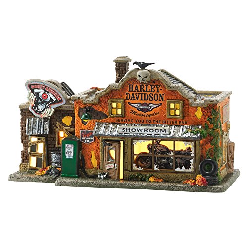 The jagged glass of broken out windows frames the showroom bike featured in the main display. “Serving You To The Bitter End” is the slogan above the door. Sculpted gas tank out front offers fuel.