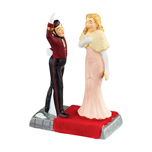 Star struck bell hop on the red carpet helps a movie starlet by hailing her a cab. Red flocking gives texture to the carpet.