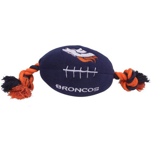Pet plush football toy has an embroidered NFL team logo and team color contrasting tug rope on either end of the ball.
