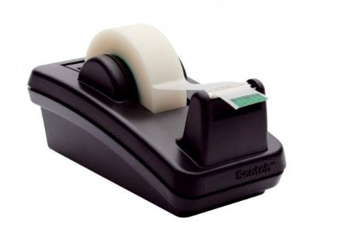 Sleek, compact design takes up less valuable desk space. Attached tape hub cannot be lost. Heavily weighted for easy, one-handed dispensing. Made from 100% post-industrial recycled plastic. Dispenses standard tapes on a 1 inch core up to 19mm x 32.9m.