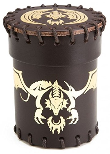 Q-Workshop Dice Cup. Dice Cup is Black Leather with Gold Design. Intricate Flying Dragon Design. Dice Cup Lid is Included.